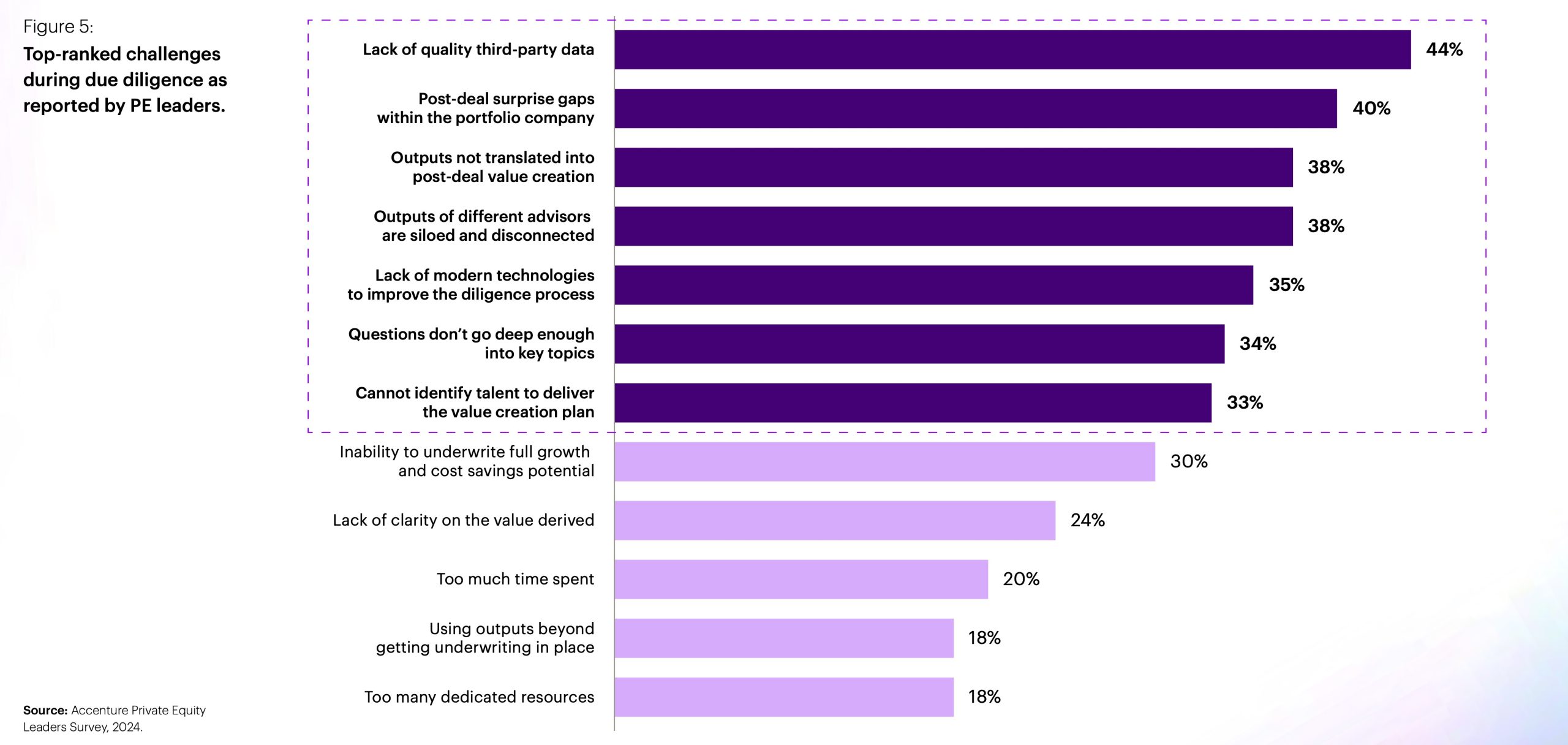 Für den Bericht mit dem Titel „It’s time to rethink Private Equity Due Diligence“ befragte Accenture 251 PE-Experten in Nordamerika, Europa und Asien bei Unternehmen, die Vermögenswerte von mindestens 5 Mrd. USD verwalten.