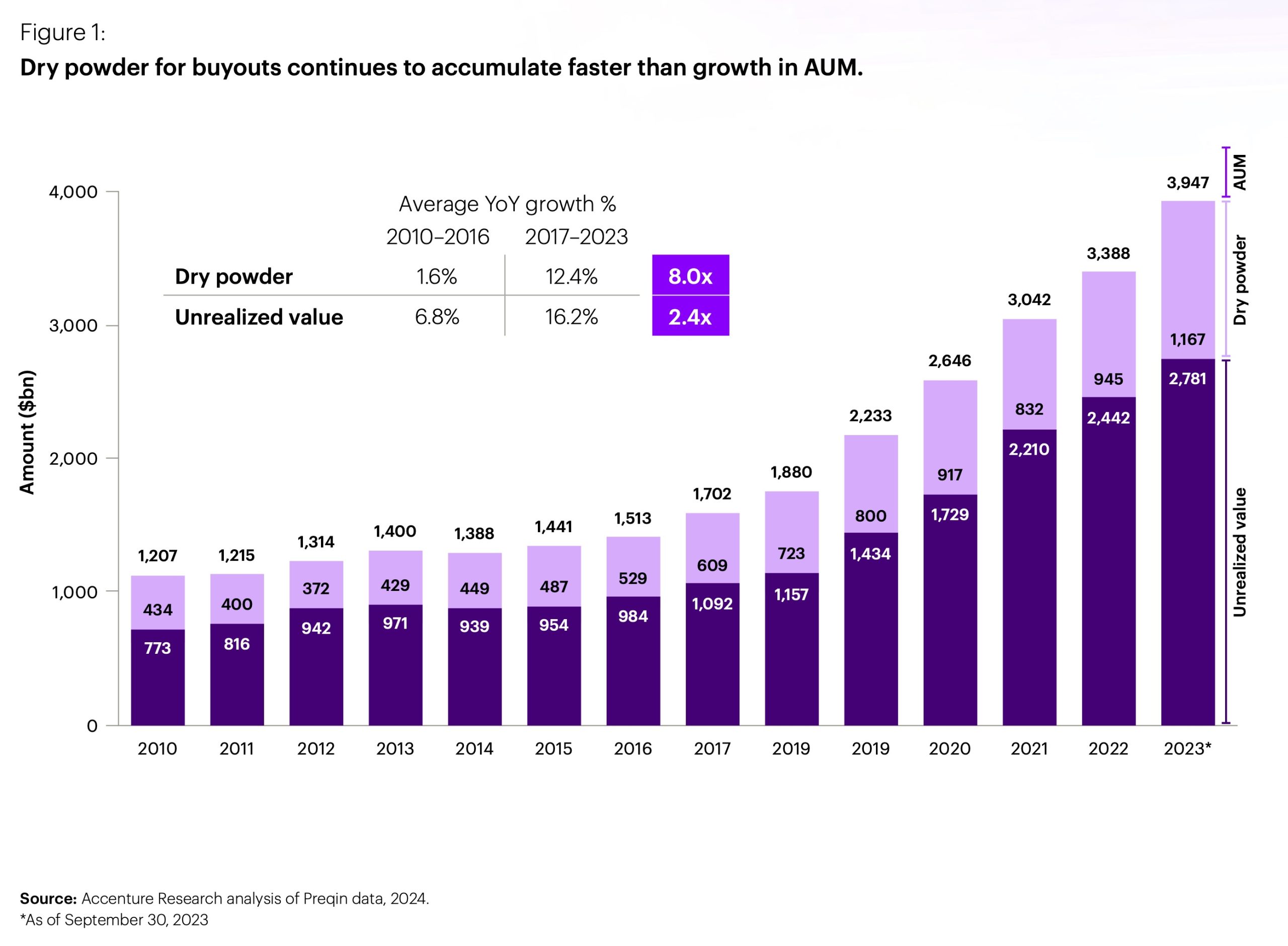Der Verbesserungsbedarf ergebe sich aus dem starken Wettbewerb in der Branche, heißt es in dem Bericht. Die Zahl der aktiven PE-Unternehmen ist gestiegen, und das verwaltete Vermögen hat seit 2019 um 77% zugelegt. Das Dry Powder für Buy outs ist laut Accenture auf ATH und stieg im Jahr 2023 um 23% auf 1,2 Bio. USD.