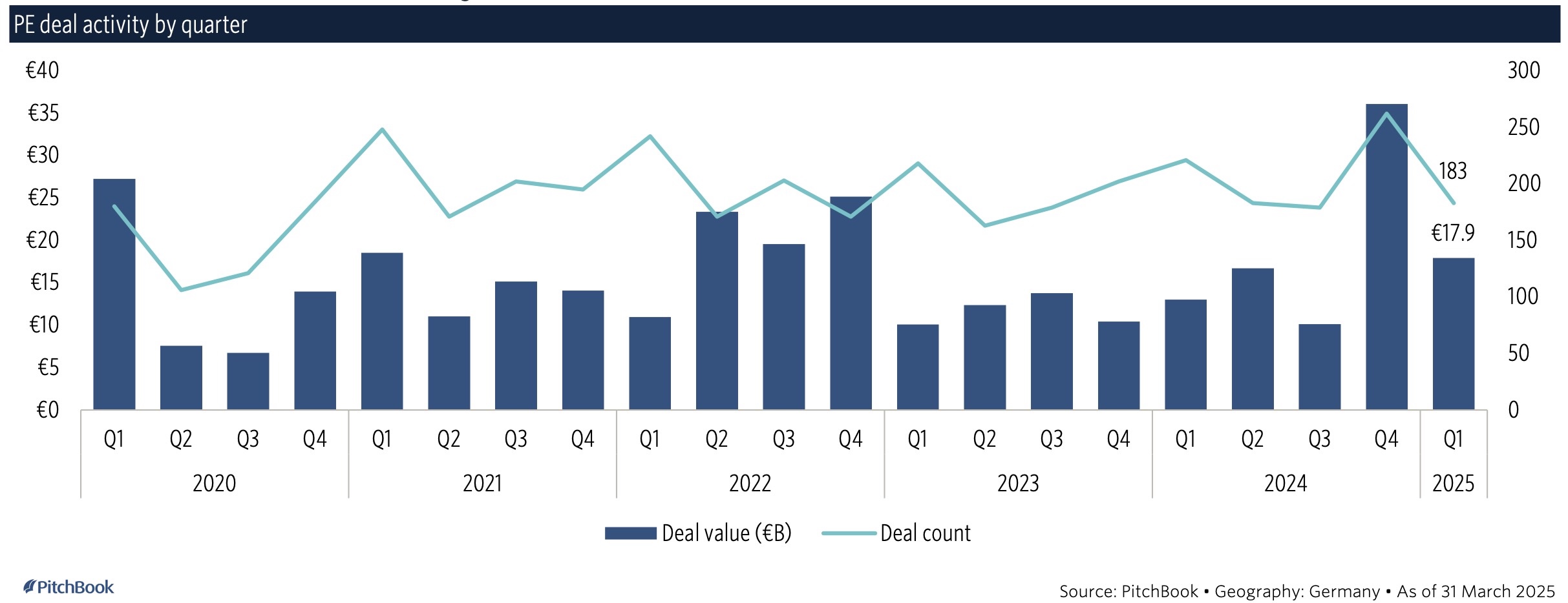 Warum in Q4 24 die PE-Deal-Aktivität nach vielen mauen Quartalen auf einmal ansprang, ist unklar. Jedoch bei solchen Statistiken immer technisch bedingte Unschärfen in die Betrachtung einbeziehen (Meldetermine, Abgrenzungsfragen etc…). Wichtig jedenfalls der Motel one-Deal: