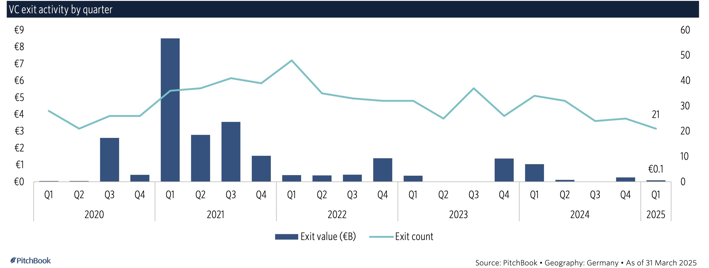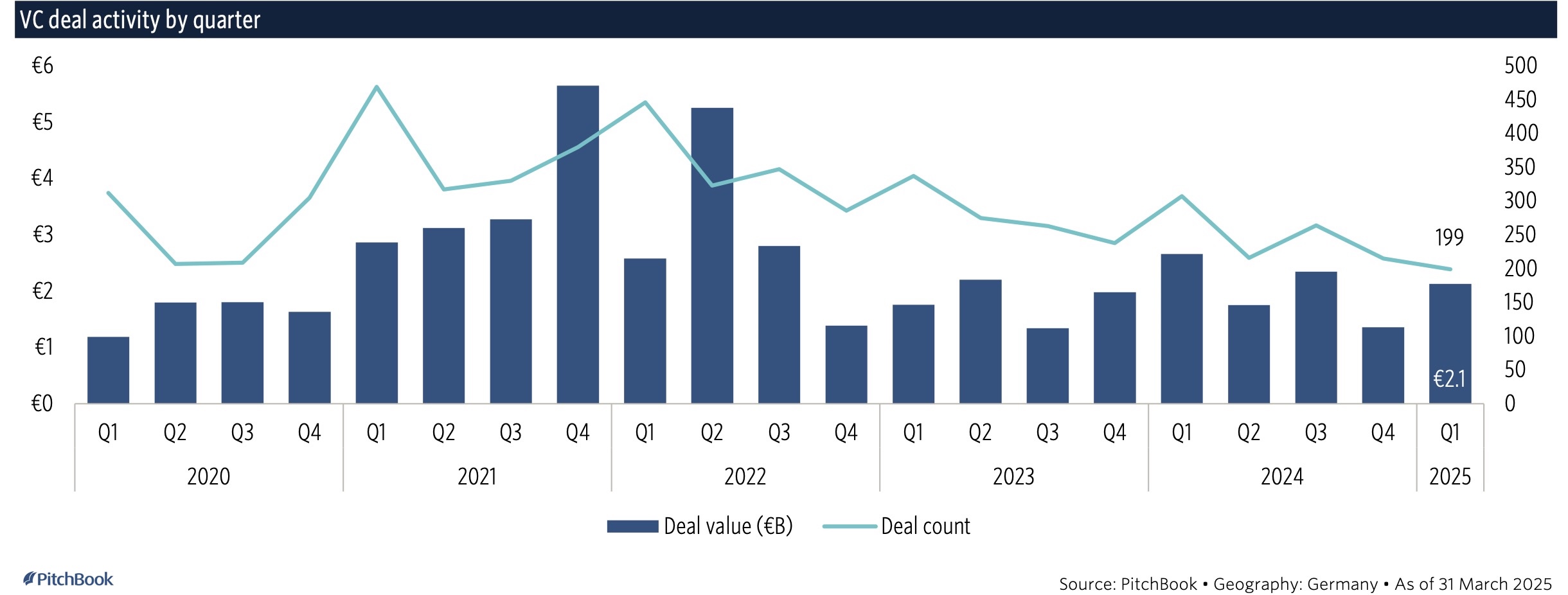 Der PitchBook-Report Germany Market Snapshot Q1-2025 komprimiert auf 19 Seiten seine Inhalte im wesentlichen über breit erläuterte Grafiken, so dass sich in Summe eine erhebliche Daten- und Informationsdichte ergibt. Die Redaktion greift im Folgenden nur einige heraus.