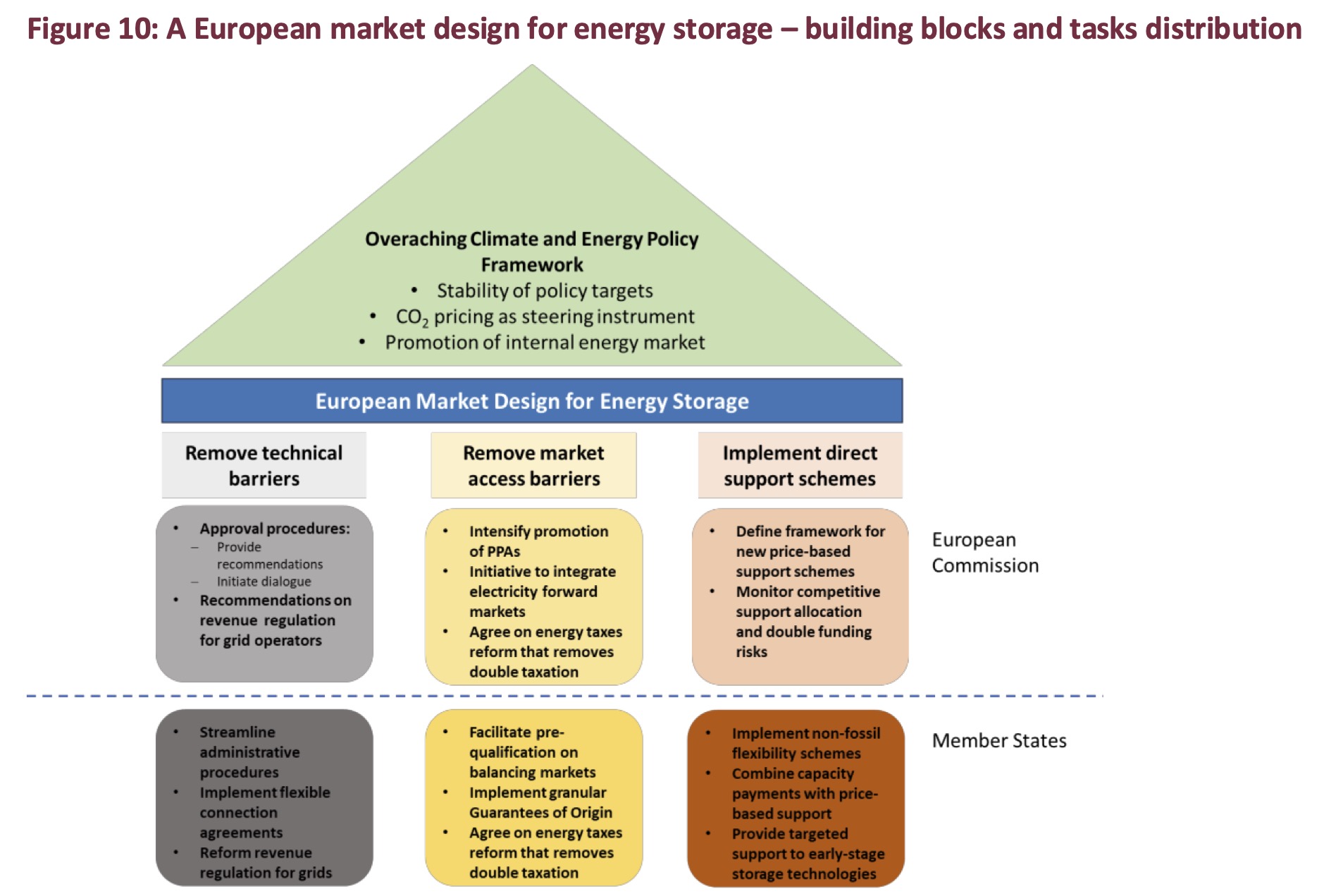 Um ein sozial optimales Kapazitätswachstum zu erreichen, hält die Studie Maßnahmen für erforderlich, um die langfristigen Systemvorteile der Energiespeicherung zu internalisieren, insb. ihren Beitrag zur Verringerung des Bedarfs an Netzausbau. Dies rechtfertige den Einsatz direkter öffentlicher Förderprogramme, denn „sich ausschließlich auf Kapazitätsmärkte zu verlassen, ist nicht die effizienteste Form der Unterstützung, da Zahlungen keine Ertragsrisiken abdecken und weitgehend unabhängig von der Marktaktivität sind.“