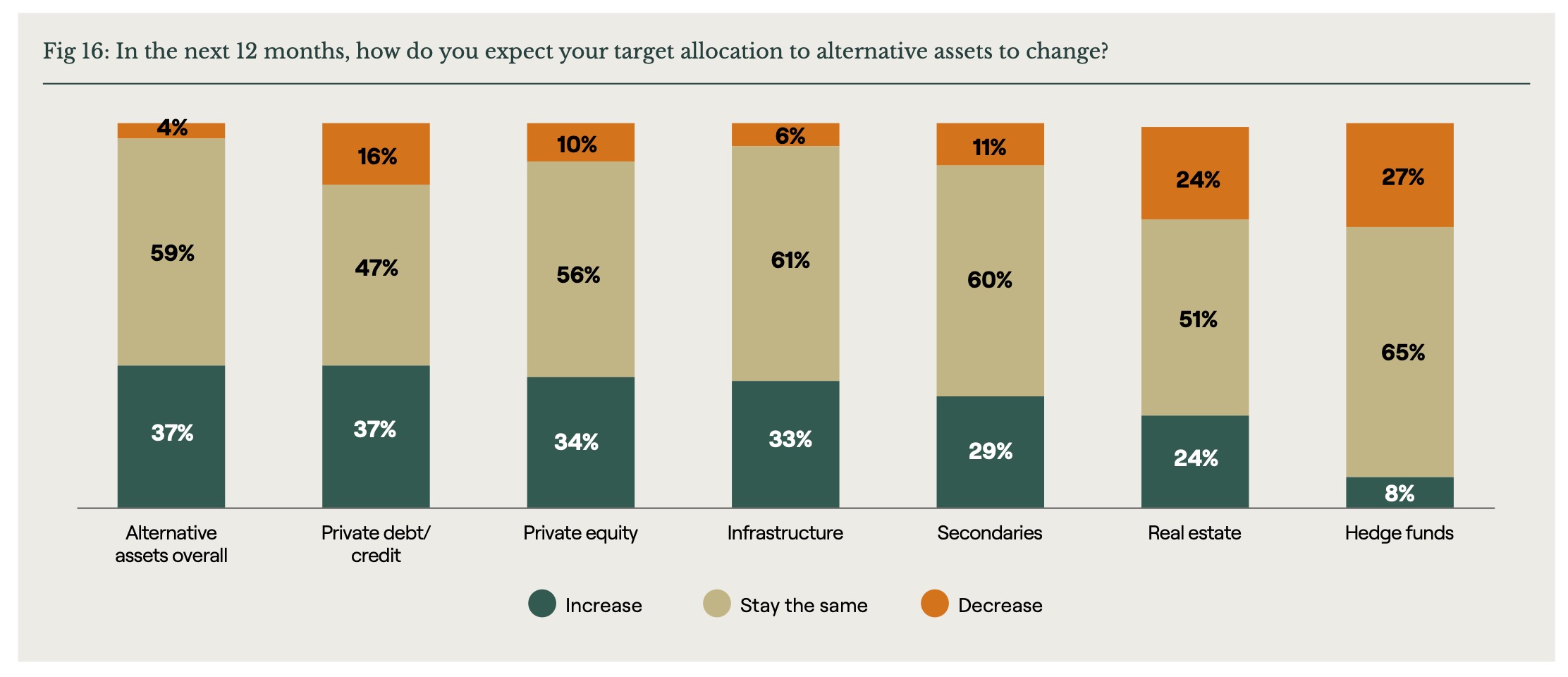 Coller wollte auch wissen, welche Segmente die LPs künftig bevorzugen werden, welche nicht. Ganz vor, wenn auch nur mit 37%: Private Debt. Ganz hinten: Hedgefonds mit 8%: