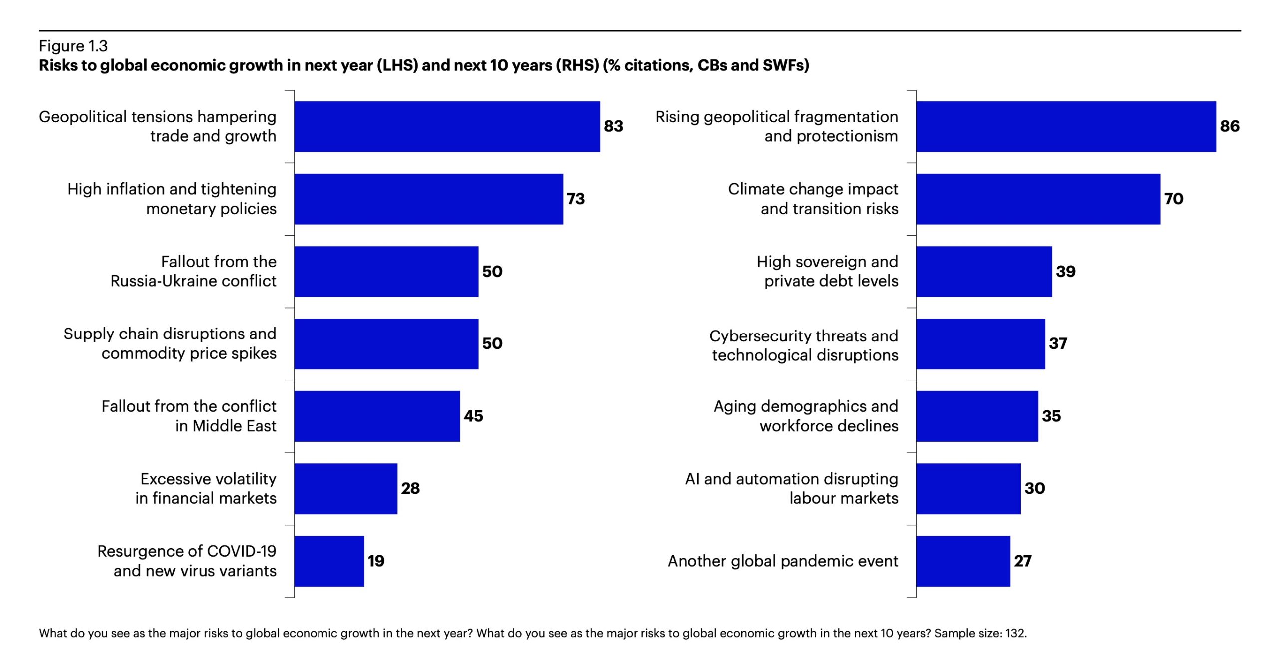 Welche Risiken treiben Staatsfonds und Zentralbanken um? Auch das hat die Studie erfragt. Ganz oben: Geopolitik, dann die Inflation, außerdem Lieferkettenstörungen sowie die Kriege/Konflikte im Osten und Nahost (was man ja irgendwie zu den geopolitischen Risiken zählen kann):