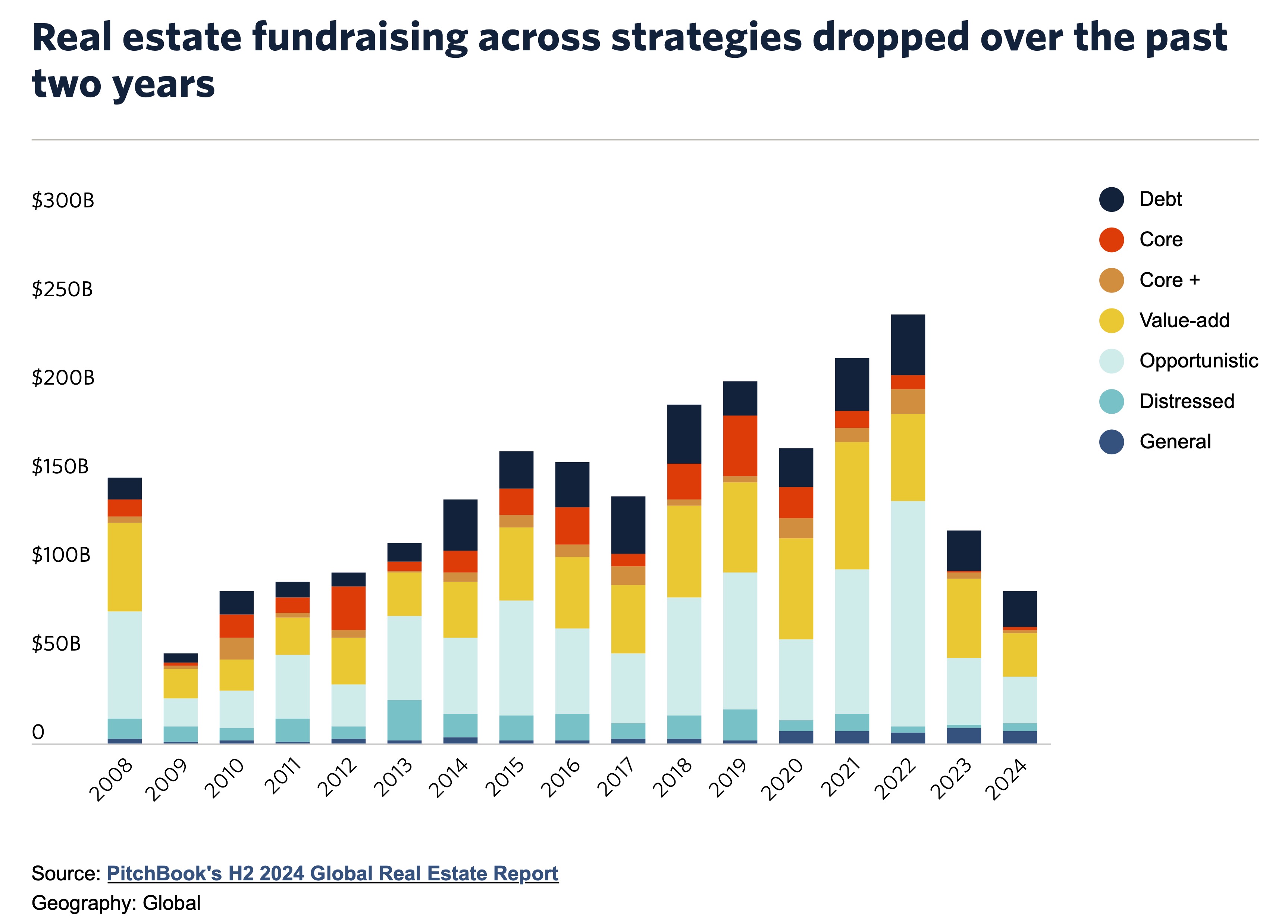 Zinsunsicherheit, steigende Inflation und zunehmende Leerstände bei Wohn- und Bürogebäuden belasten weiter den Markt, und so hat PitchBook für 2024 ein Immobilienfundraising von 85,8 Mrd. US-Dollar registriert, weit entfernt vom Rekordwert von den 241,7 Mrd. US-Dollar im Jahr 2022.