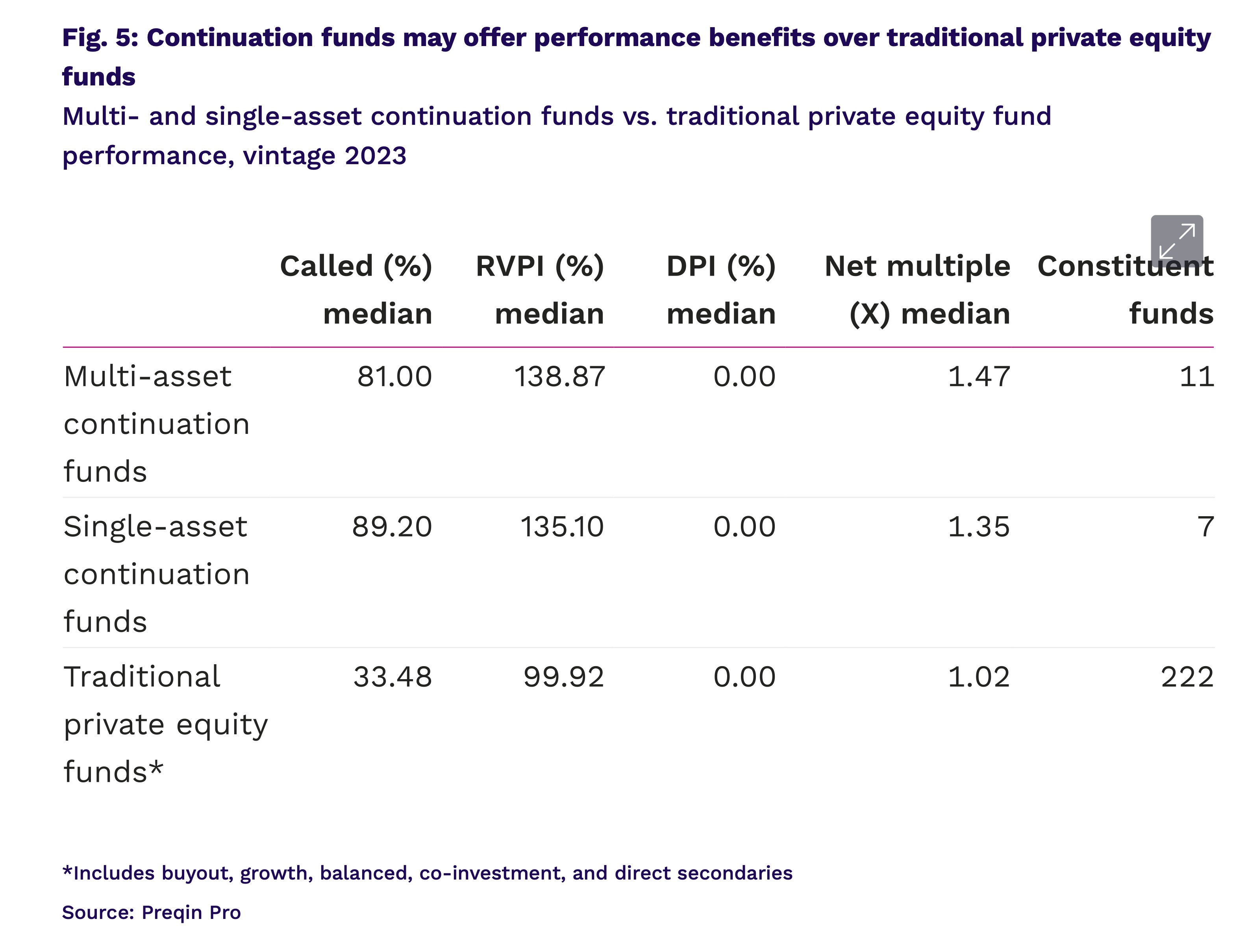 Und die Performance? Preqin hat eine kleine Stichprobe vorgenommen. Demnach erzielten Multi-Asset-Contis des Jahrgangs 2023 einen medianen Netto-Multiplikator von 1,47x und Single-Asset-Fonds von 1,35x, verglichen mit 1,02x für traditionelle PE-Fonds desselben Jahrgangs: