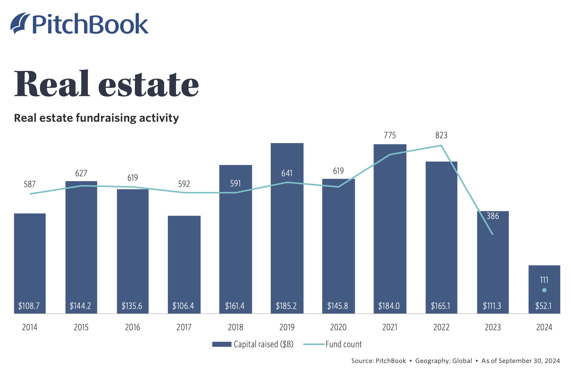 PitchBook vermeldet für das laufende Jahr 111 neu geclosde Immobilienfonds mit einem Gesamtvolumen von 52,1 Mrd. US-Dollar. Dies entspricht weniger als der Hälfte der im Jahr 2023 eingesammelten 111,3 Mrd. US-Dollar, welche selbst fast den Tiefpunkt des vergangenen Jahrzehnts repräsentierten.
